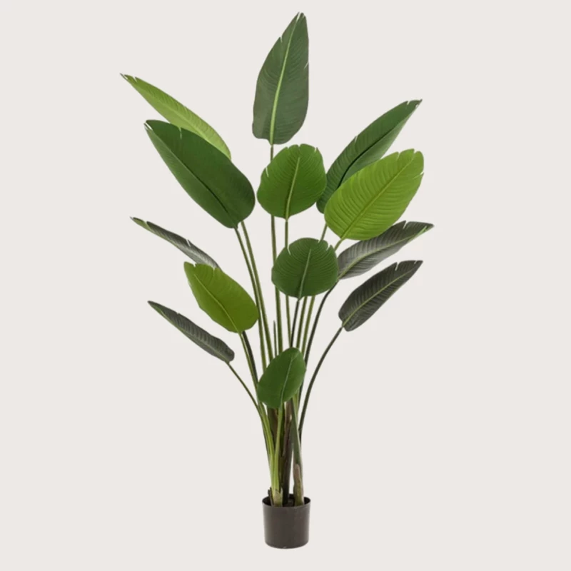 Strelitzia Plant Green o výšce H190 D120 přináší do interiéru tropickou atmosféru a moderní eleganci. Díky svým širokým, banánově tvarovaným listům a štíhlým stonkům působí velmi přirozeně a esteticky výrazně.