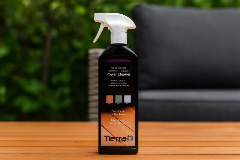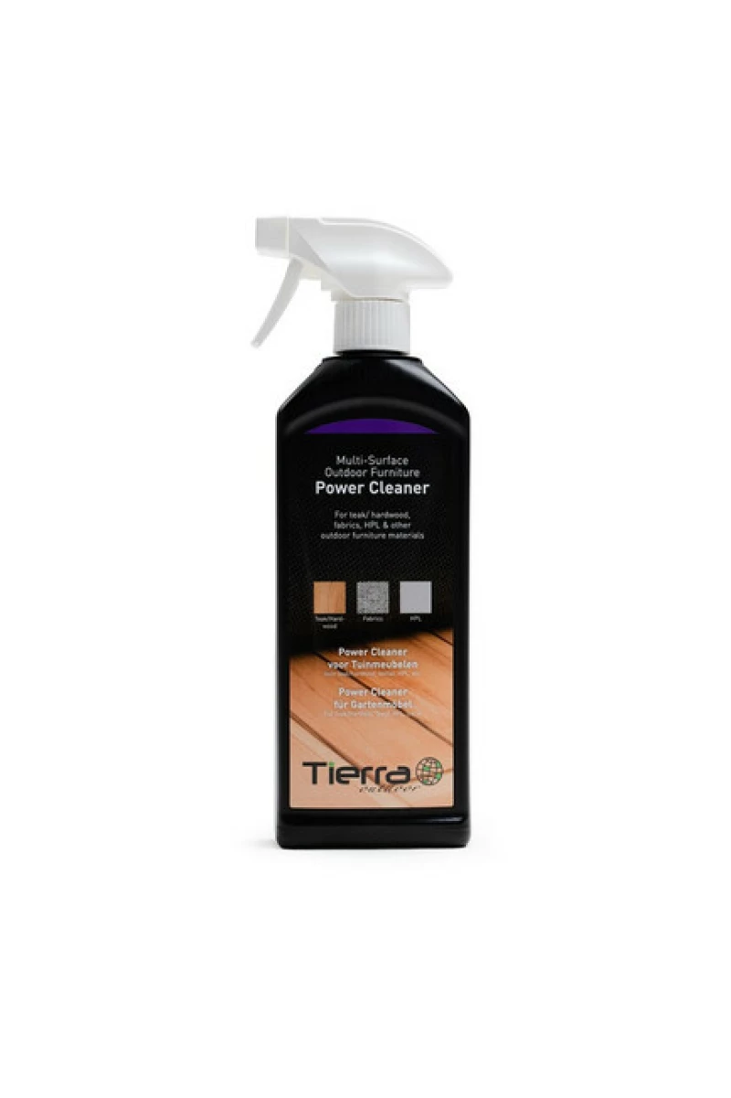 Univerzální čistič Tierra Outdoor Power Cleaner 500 ml pro hliník, teak, umělý ratan, Swiss Fabrics, rope výplet i desky Trespa a Dekton. Šetrná a účinná péče pro dlouhou životnost venkovního nábytku.