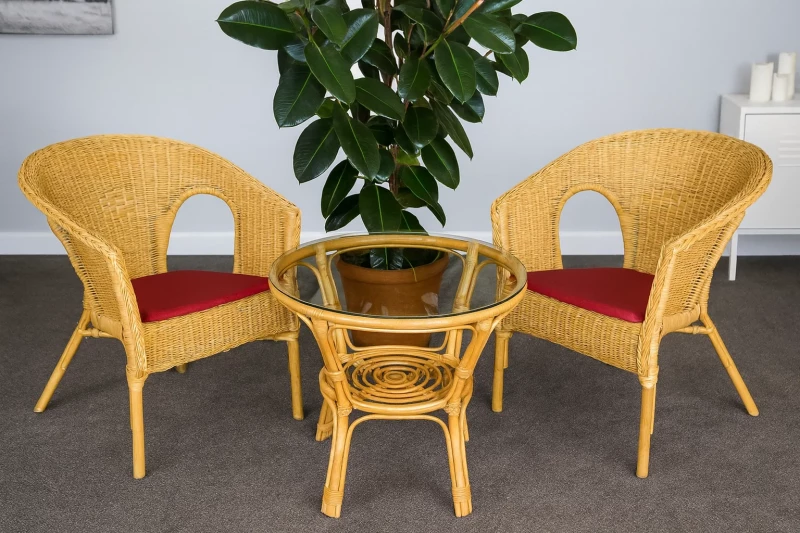 Součástí setu jsou dvě pohodlná křesla a praktický kulatý stolek se skleněnou deskou. V ceně je zahrnuta také kompletní sada čalounění podle fotografie, která zajišťuje příjemné a pohodlné sezení. Medový odstín ratanu působí teple, útulně a skvěle doplní přírodní i moderní interiér.
