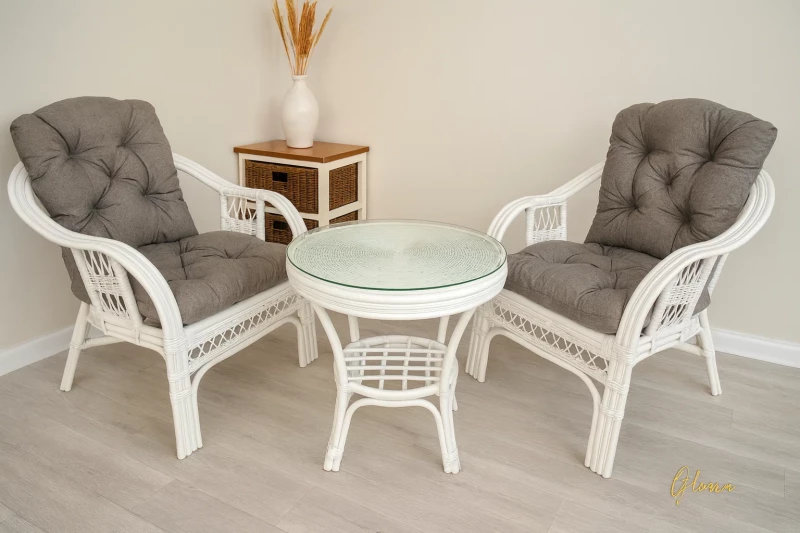 Ratanová sedací souprava Rio De Janeiro 2+1 v bílé barvě je vyrobena z přírodního ratanu z masivních ratanových tyčí, které zajišťují vysokou pevnost a stabilitu. Konstrukce je na mnoha místech trojitá, což výrazně prodlužuje životnost a odolnost celé soupravy. Set obsahuje dvě pohodlná křesla, stolek se skleněnou deskou a kompletní sadu polstrů.