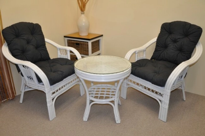Ratanová sedací souprava Rio De Janeiro 2+1 v bílé barvě je vyrobena z přírodního ratanu z masivních ratanových tyčí, které zajišťují vysokou pevnost a stabilitu. Konstrukce je na mnoha místech trojitá, což výrazně prodlužuje životnost a odolnost celé soupravy. Set obsahuje dvě pohodlná křesla, stolek se skleněnou deskou a kompletní sadu polstrů.