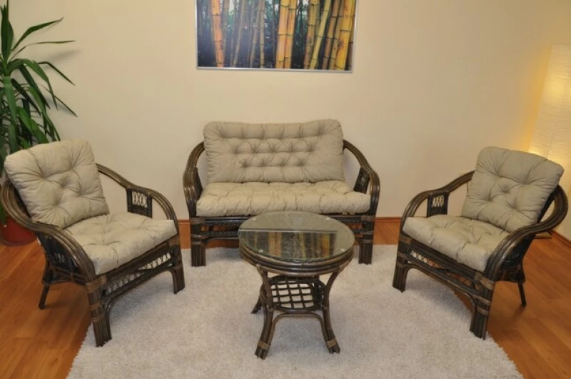 Ratanová sedací souprava Rio de Janeiro patří mezi klasiku z přírodního ratanu, která vyniká vysokou pevností, kvalitním zpracováním a nadčasovým designem. Konstrukce je vyrobena z masivních ratanových tyčí, přičemž hlavní nosné části jsou vedeny v trojitém provedení, což výrazně zvyšuje stabilitu i životnost nábytku.
