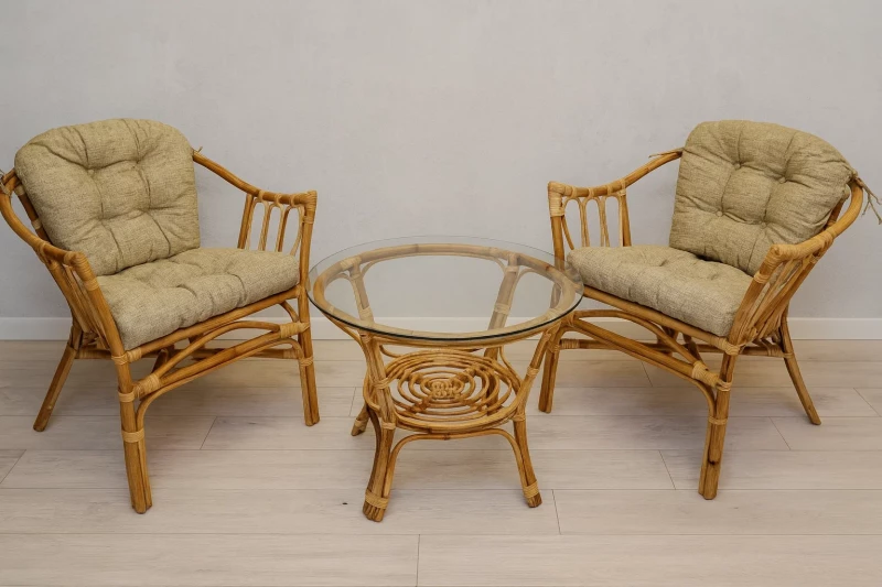 Set je vhodný do interiéru, zimních zahrad nebo na kryté terasy, kde vytvoří útulné, přírodní a stylové posezení.