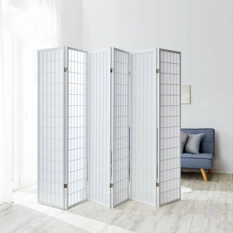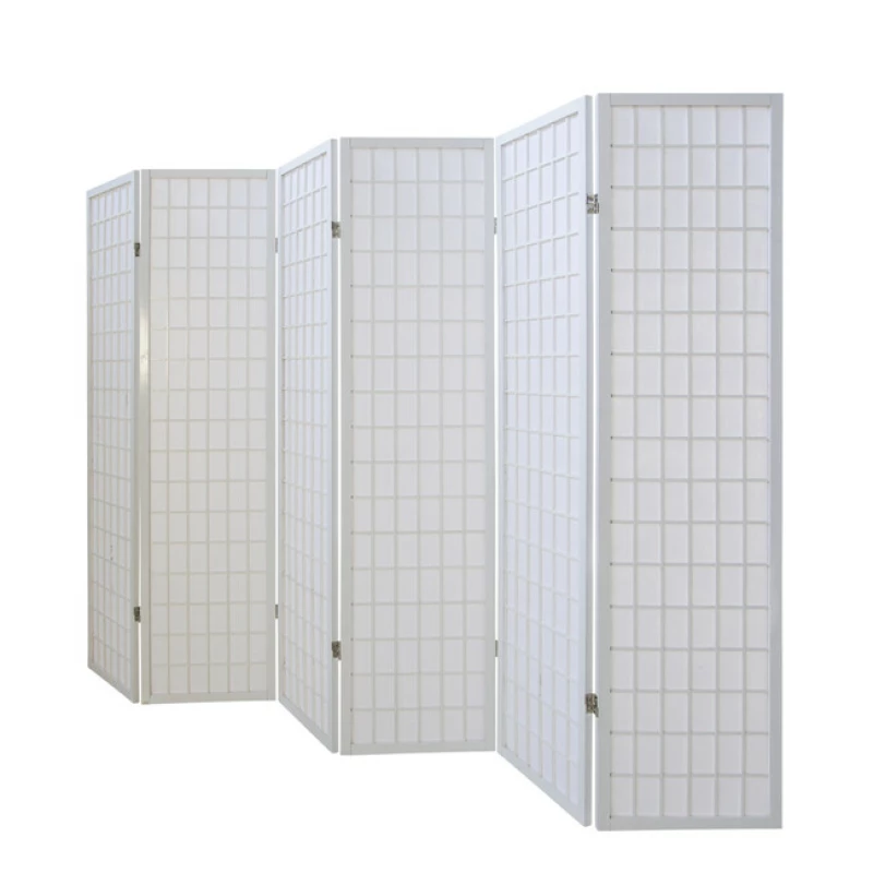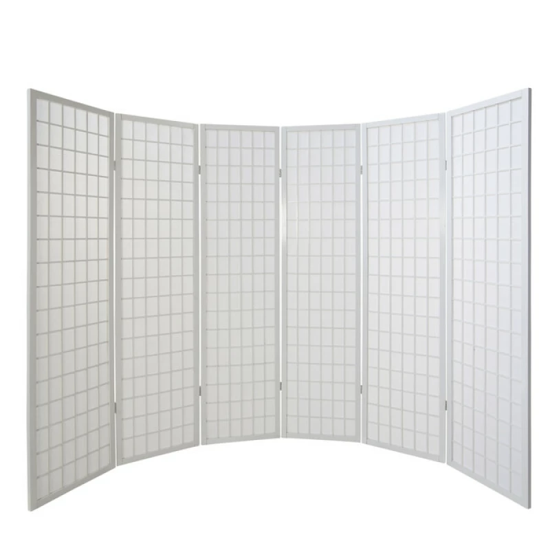 Šestidílný japonský paraván s bílým dřevěným rámem v přírodním odstínu a výplní z bílého rýžového papíru je dokonalou kombinací elegance, lehkosti a praktičnosti.