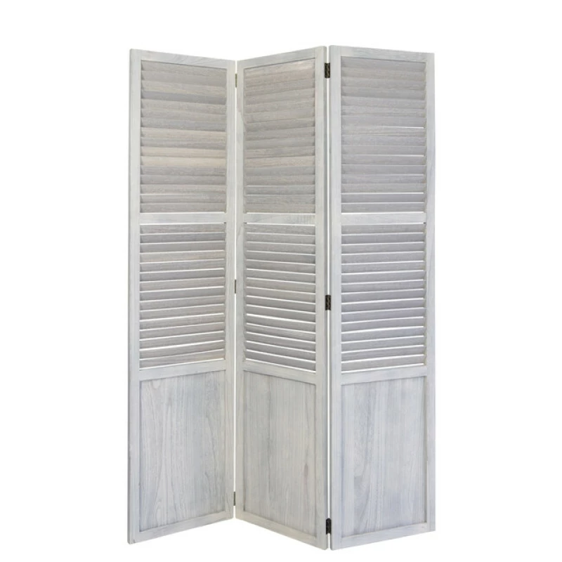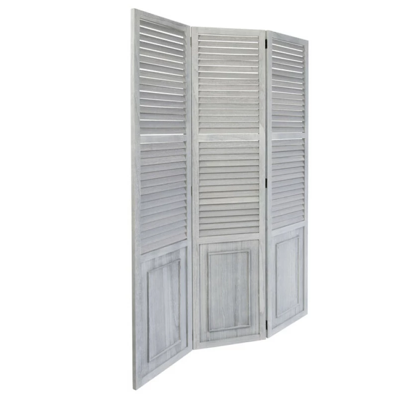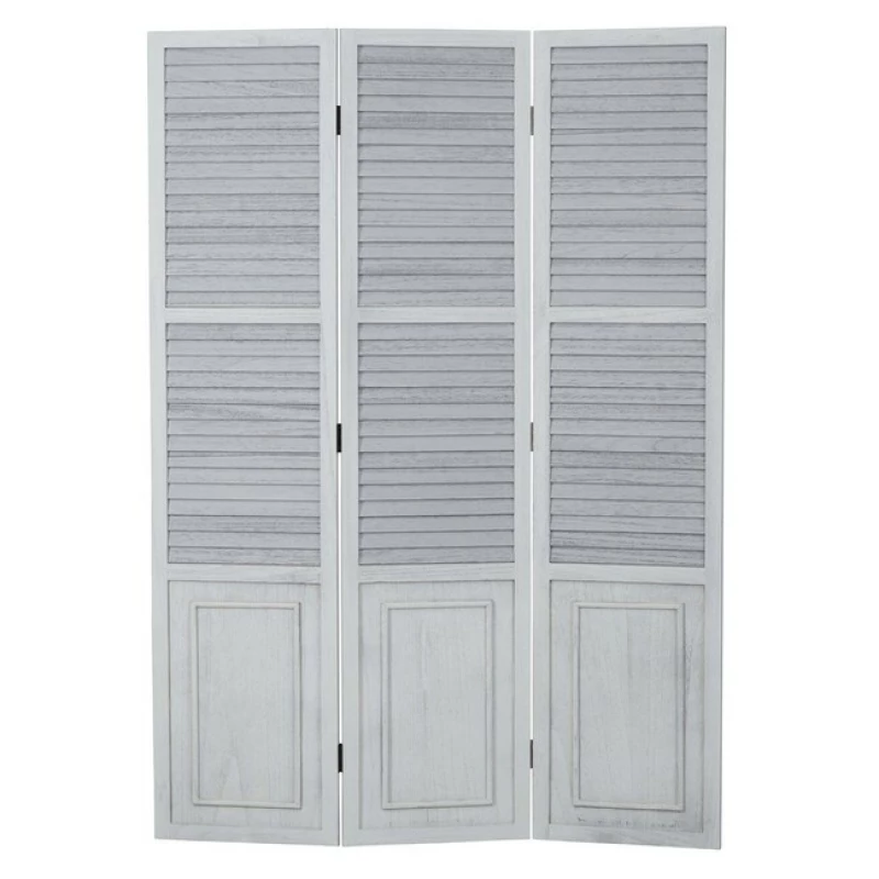Třídílný dřevěný paraván v šedé barvě, výška 170 cm. Praktická dělící stěna i dekorace interiéru. Skládací, snadno nastavitelný a oboustranný. Vhodný do domácností, salonů, wellness i kaváren.