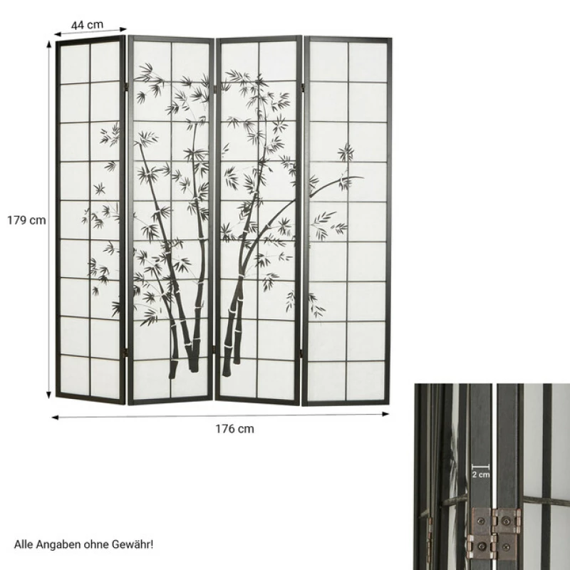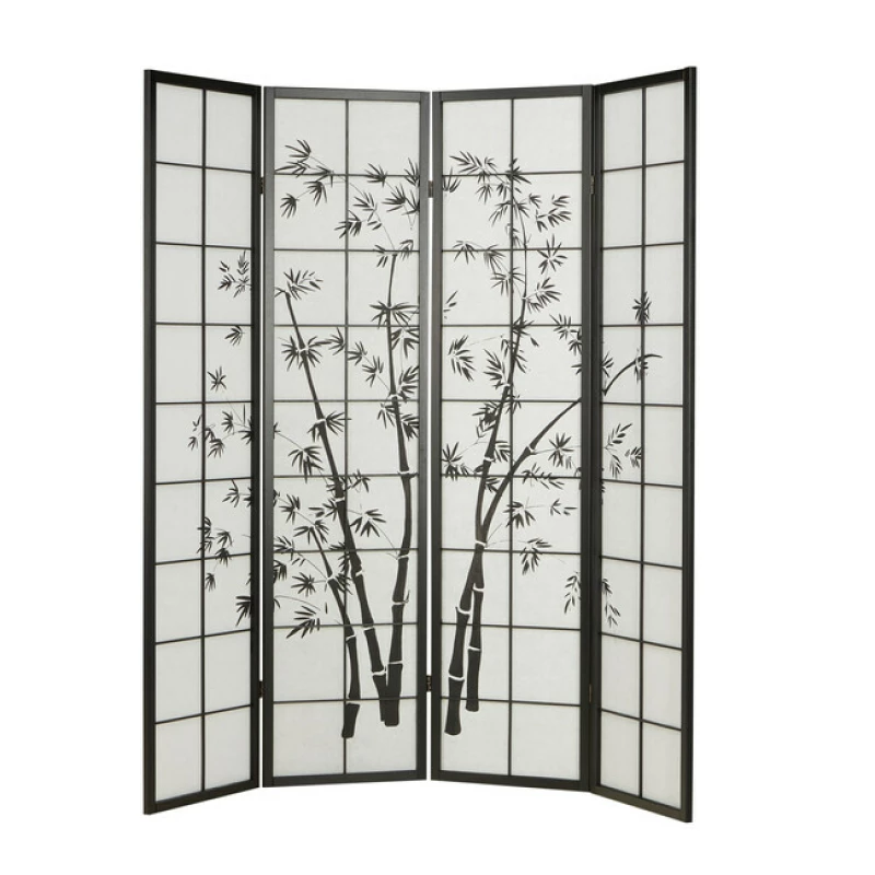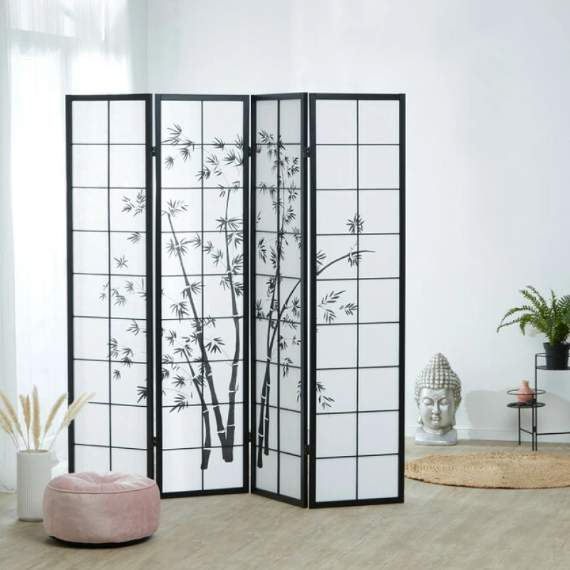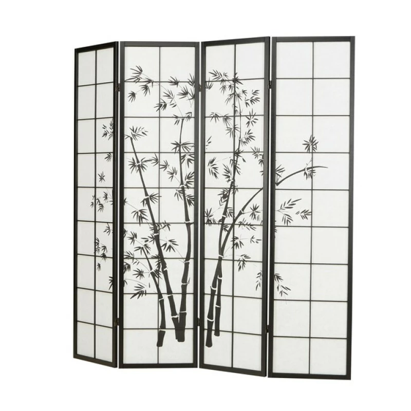 Japonský čtyřdílný paraván s motivem bambusu, černým rámem a rýžovým papírem je praktická dělící stěna i elegantní dekorace. Hodí se do domácností, salonů, wellness i kaváren. Výška 175 cm, šířka 4×44 cm.
