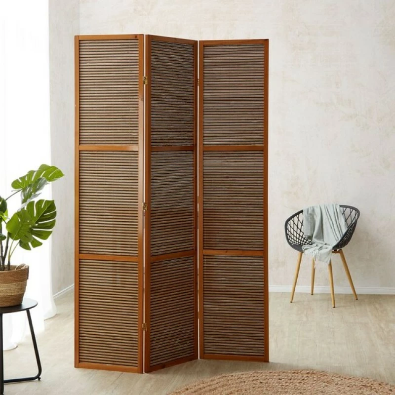 Vyšší třídílný bambusový paraván s hnědým rámem a lamelovou výplní. Neprůhledná dělící stěna pro soukromí i design. Skvělý do domácností, wellness, salonů i kaváren. Výška 200 cm, šířka 3×44 cm.