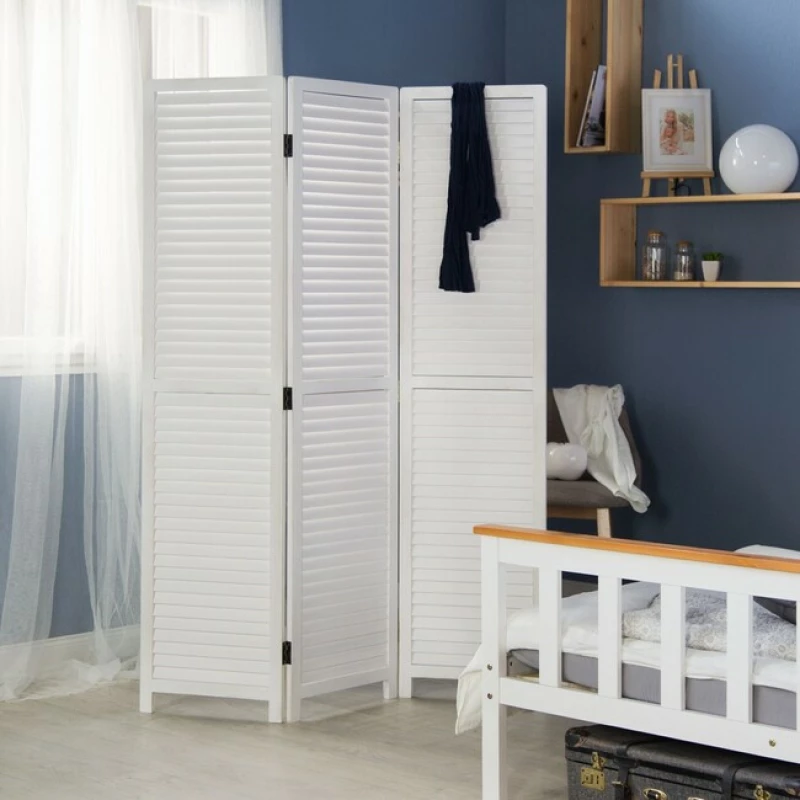 Třídílný bílý dřevěný paraván s výškou 170 cm. Praktická dělící stěna i elegantní dekorace interiéru. Snadno se skládá, šetří prostor a vytváří soukromí v domácnostech, salonech i kavárnách.