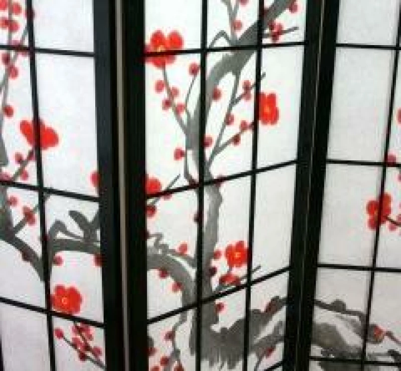 Čtyřdílný paraván s motivem sakury je skvělou volbou pro ty, kteří chtějí do interiéru vnést harmonii, praktičnost a exotický styl. Černý dřevěný rám v kombinaci s jemnou výplní z rýžového papíru a motivem rozkvetlé větvičky japonské třešně působí originálně a stylově.