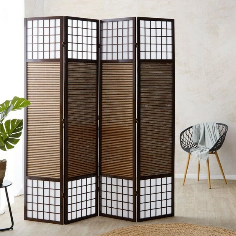 Vysoký čtyřdílný bambusový paraván s tmavě hnědým rámem a kombinací bambusových lamel a rýžového papíru. Stylová dělící stěna pro soukromí i dekoraci. Výška 200 cm, šířka 4×44 cm.