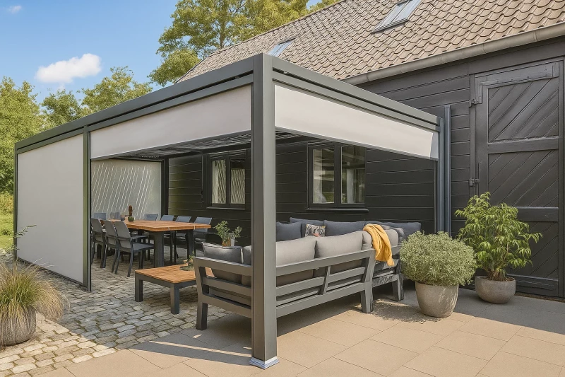 Čelní stínící roleta Deluxe na hliníkovou pergolu MARANZA 720 je prémiové řešení určené speciálně na čelní stěnu přístřešku. Tato luxusní screenová roleta poskytuje maximální ochranu před sluncem, větrem a zajišťuje dokonalé soukromí díky pokročilému kazetovému systému a kvalitním materiálům.