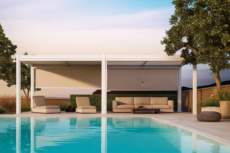 Bílé provedení stínící rolety přináší do venkovního prostoru čistotu a eleganci. Bílá barva odráží sluneční paprsky a teplo, což pomáhá udržovat prostor pod pergolou chladnější během horkých letních dnů. Navíc vytváří příjemný kontrast s tmavšími konstrukcemi pergoly nebo harmonicky doplňuje světlé provedení hliníku.