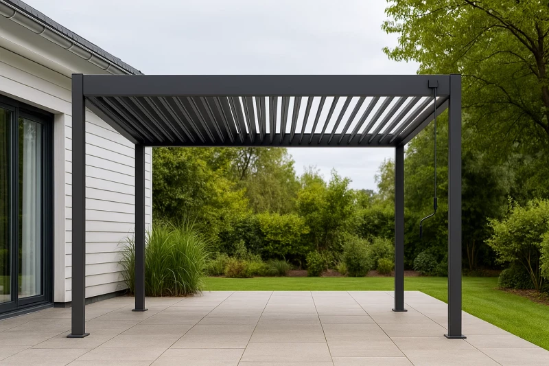 Kompaktní terasová pergola POSITANO 360×360×250 cm v matném antracitu s nastavitelnými lamelami. Odolná do 140 km/h, ochrana před deštěm 17 l/m²/hod, manuální ovládání. Záruka 5 let, maximální zatížení 80 kg/m². Ideální pro menší terasy, snadná montáž.