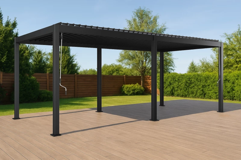 Díky čistému designu v matném antracitovém odstínu působí pergola nadčasově a elegantně – skvěle ladí s moderní architekturou i přírodními exteriéry.
