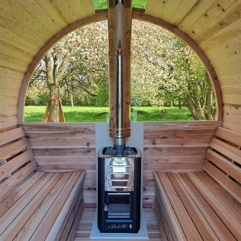Venkovní sudová sauna TR170 – Halfglas pro 2 osoby z červeného cedru spojuje moderní design, odolnost a luxusní relaxaci. Díky prosklení a dokonalé cirkulaci vzduchu nabízí stylové wellness přímo ve vaší zahradě.