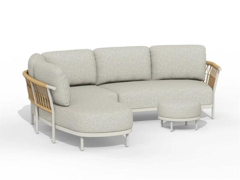 Zahradní lounge set Tierra Outdoor Fresca v pravém provedení zahrnuje levou dvousedačku (199,5 cm), pravé lehátko (118,5 cm) a konferenční stolek s polštářem. Krémově bílý hliníkový rám, kvalitní polštáře. Odolný vůči povětrnosti s 3letou zárukou.