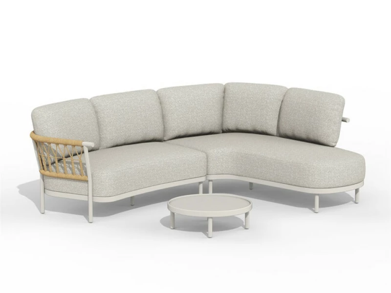 Zahradní lounge set Tierra Outdoor Fresca v pravém provedení zahrnuje levou dvousedačku (199,5 cm), pravé lehátko (118,5 cm) a konferenční stolek s polštářem. Krémově bílý hliníkový rám, kvalitní polštáře. Odolný vůči povětrnosti s 3letou zárukou.