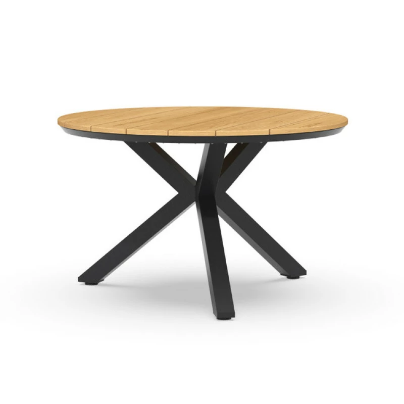 Kulatý teakový stůl Tierra Outdoor Orbital Ø120 cm s hliníkovým rámem v antracitové barvě. Elegantní a odolný zahradní stůl z teaku FSC® pro 4 osoby – ideální na terasu i do altánu.