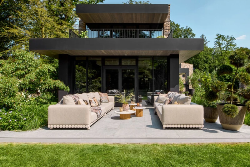 Tato konfigurace poskytuje dokonalé uspořádání pro velké terasy, zahrady nebo prostory u bazénu, kde můžete vytvořit kompletní venkovní obývací pokoj.