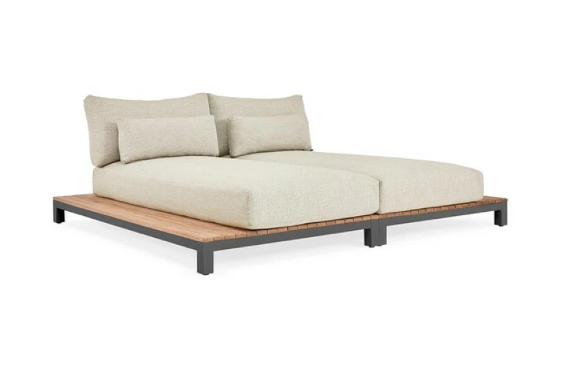 Platforma z teakového dřeva dodává posteli přirozené teplo, zatímco hliníková konstrukce zaručuje pevnost, odolnost a dlouhou životnost. Díky promyšleným detailům, jako jsou pevné spojovací úchyty se smyčkou a dřevěnou paličkou, polštáře dokonale drží na svém místě – žádné klouzání ani posouvání při používání. Velkorysé boční plochy rámu lze využít jako odkládací místo pro nápoje, knihy či dekorace, což dělá z této postele také praktický venkovní kus nábytku.