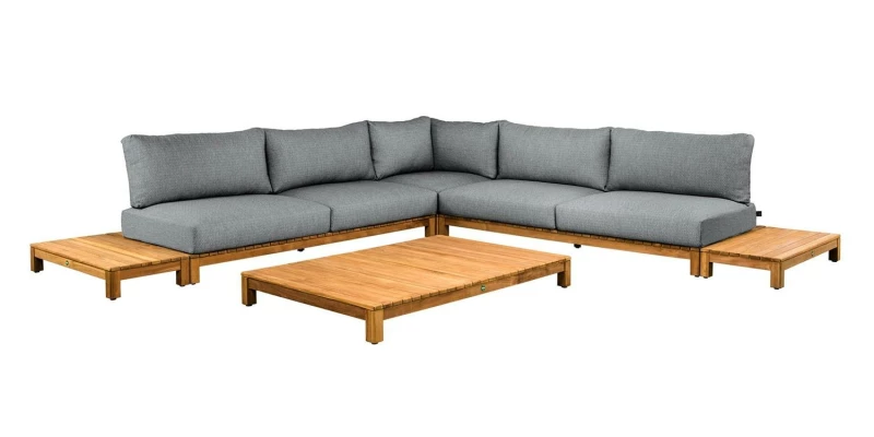 Luxusní zahradní sedací souprava SUNS Portofino II z teaku a hliníku. Modulový design, polštáře Sunproof® s rychleschnoucí výplní, odolnost vůči počasí. Stylový relax na terase po celý rok.