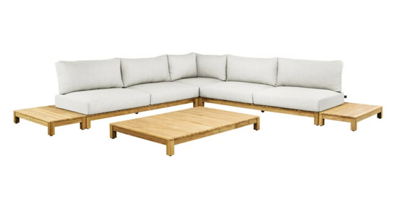 Luxusní zahradní sedací souprava SUNS Portofino II z teaku a hliníku. Modulový design, polštáře Sunproof® s rychleschnoucí výplní, odolnost vůči počasí. Stylový relax na terase po celý rok.
