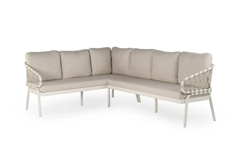 Základem sestavy je práškově lakovaný hliník v elegantní krémově bílé barvě. Tento materiál se vyznačuje extrémní odolností vůči korozi, UV záření i vlhkosti, což umožňuje celoroční používání bez nutnosti složité údržby. Otevřená konstrukce opěradla a ručně spletený lanový výplet s diamantovým uzlem vytvářejí lehký a vzdušný design, který zároveň zaručuje pevnost i estetickou originalitu.