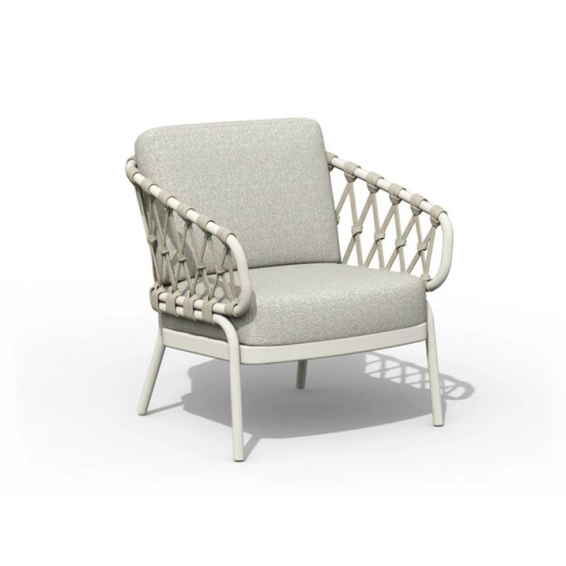 Křeslo je vyrobeno z prvotřídního hliníku s práškovým nástřikem v krémově bílé barvě, který je lehký, odolný a zcela bezúdržbový. Otevřená zádová konstrukce a lanový výplet z olefinového lana s ručně pletenými diamantovými uzly dodávají křeslu vzdušnost a jemný estetický detail, který podtrhuje jeho sofistikovaný vzhled. Elegantní kombinace krémově bílé konstrukce a polštářů v odstínu Dove grey vytváří harmonický celek vhodný do moderních i přírodních exteriérů.