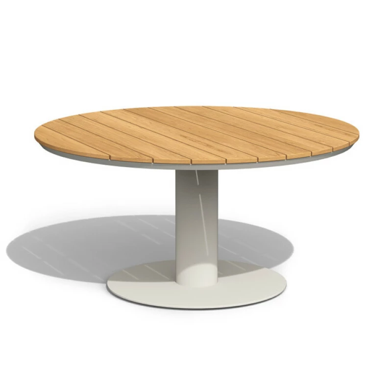 Zahradní jídelní stůl Tierra Outdoor Morena Teak Ø120 cm – nízký teakový stůl pro 4 osoby s hliníkovým rámem v krémové barvě. Stylový, odolný a ideální pro lounge stolování na terase.