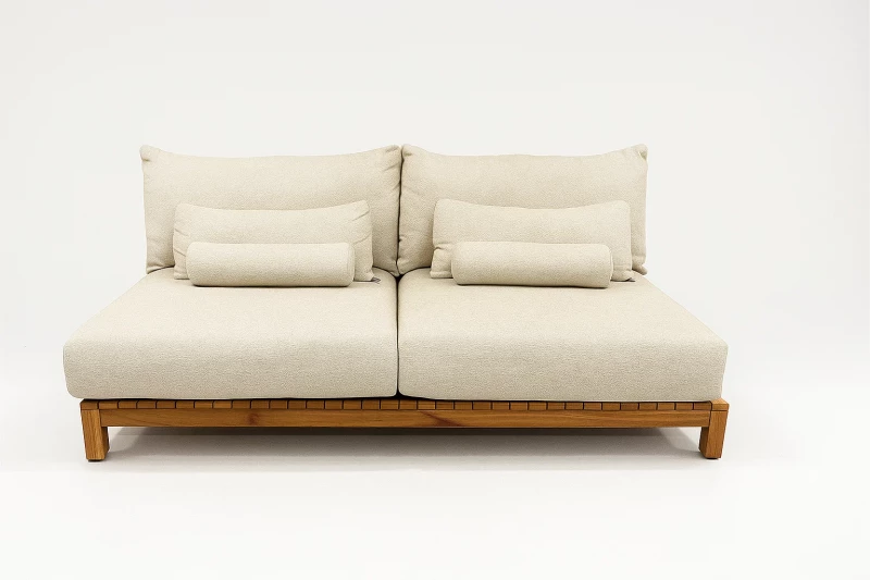 Luxusní 2-místná zahradní pohovka SUNS Portofino (214×107×86 cm) s teakovou základnou a hliníkovými opěradly. Fast Dry Foam polštáře s prémiovou látkou Sunproof®. Inovativní fixace polštářů, modulární systém. Dostupná v Soft Pink a Soft Grey.