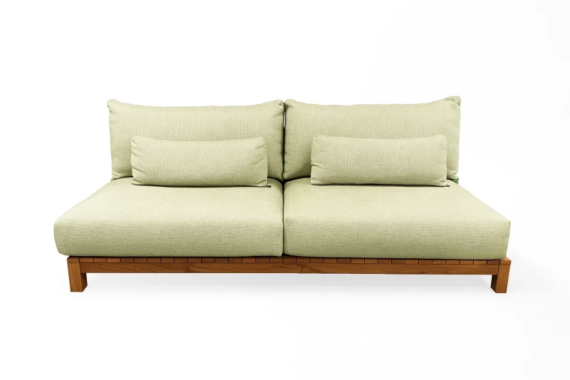 Luxusní 2-místná zahradní pohovka SUNS Portofino (214×107×86 cm) s teakovou základnou a hliníkovými opěradly. Fast Dry Foam polštáře s prémiovou látkou Sunproof®. Inovativní fixace polštářů, modulární systém. Dostupná v Soft Pink a Soft Grey.