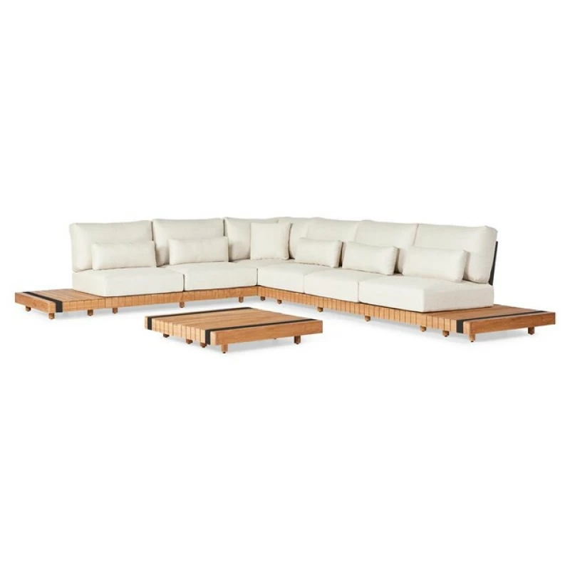 Sedací souprava je navržena v pevném rohovém uspořádání bez příručních stolků, které nabízí maximální využití prostoru. Součástí jsou čtyři elegantní teakové příruční stolky, které doplňují funkčnost i estetiku celé sestavy.