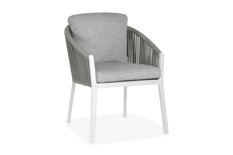 Zahradní jídelní židle SUNS Avero s lanovým výpletem ve vzoru rybí kosti. Extra široké sezení, hliníkový rám a polštáře z tkaniny Sunproof® pro luxusní venkovní komfort.