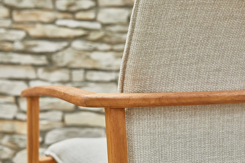 Židle SUNS Florine je vyrobena z certifikovaného teakového dřeva, které se pyšní mimořádnou pevností, dlouhou životností a odolností vůči povětrnostním vlivům. Teak se přirozeně proměňuje ze zlatavého odstínu do elegantní stříbrošedé patiny, jež podtrhuje jeho přirozený charakter.