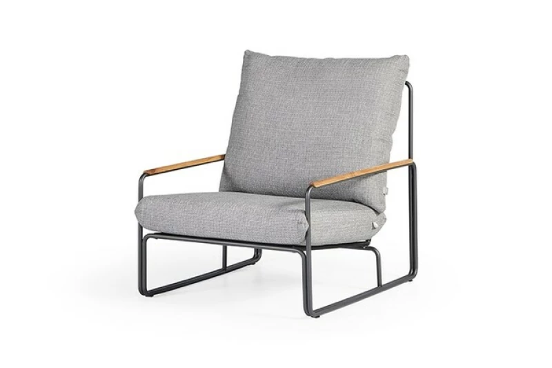 Rám křesla je vyroben z nerezavějící oceli a područky jsou vkusně potaženy teakovým dřevem. Křeslo má poměrně vysoké opěradlo pro zajištění optimálního pohodlí při sezení. Potahy na polštáře jsou vyrobeny z prémiové outdoorové látky Sunproof® Olefin, která si dokáže zachovat barevnou stálost a snadno se čistí. Sunproof® Olefin je navíc mimořádně příjemný materiál na dotek.