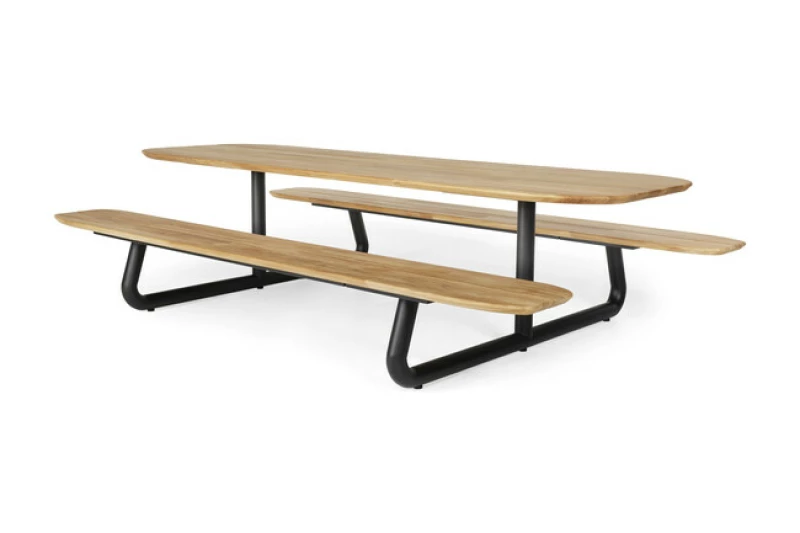 Objevte krásu a funkčnost v dokonalé rovnováze se zahradním piknikovým stolem SUNS Ferla, který spojuje přírodní teakové dřevo a odolný ocelový rám v moderním designu.