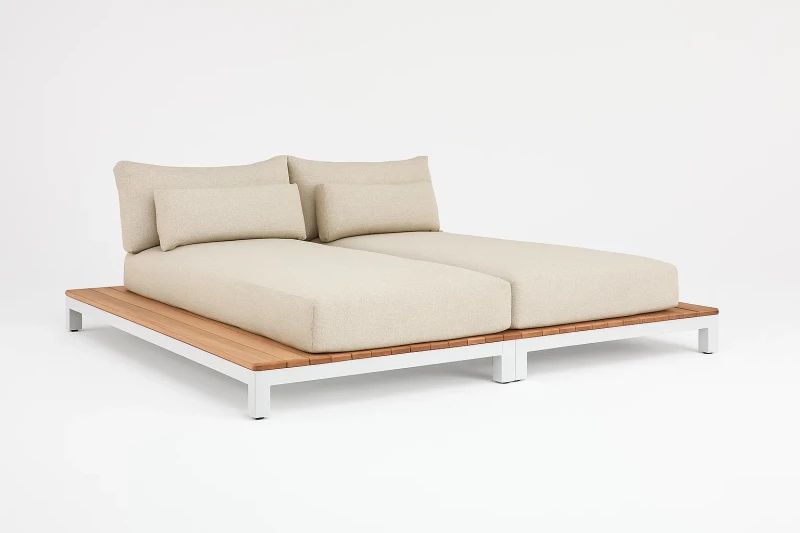 Luxusní zahradní postel SUNS EVORA DAYBED (229×200×84 cm) s hliníkovou konstrukcí a teakovou platformou. Quick Dry Foam rychleschnoucí pěna, potahy Sunproof® odolné UV a vlhkosti.