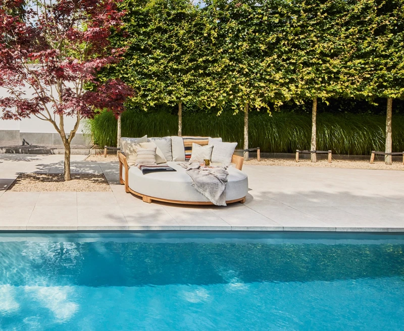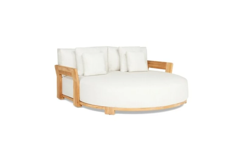 Zahradní postel SUNS Vento z teakového dřeva – luxusní design, kulatý tvar, čalounění Sunproof® a maximální pohodlí. Elegantní oáza klidu pro vaši terasu nebo zahradu.