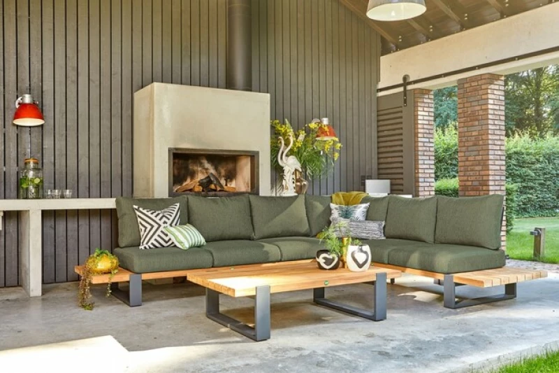 Zahradní rohová souprava SUNS Nardo v industriálním stylu kombinuje hliníkový rám s certifikovaným teakem. Obsahuje 3místnou a 2místnou pohovku s bočními stoly a konferenční stolek. Vodoodpudivé polštáře Sunproof®. 5letá záruka. Antracit/soft green.