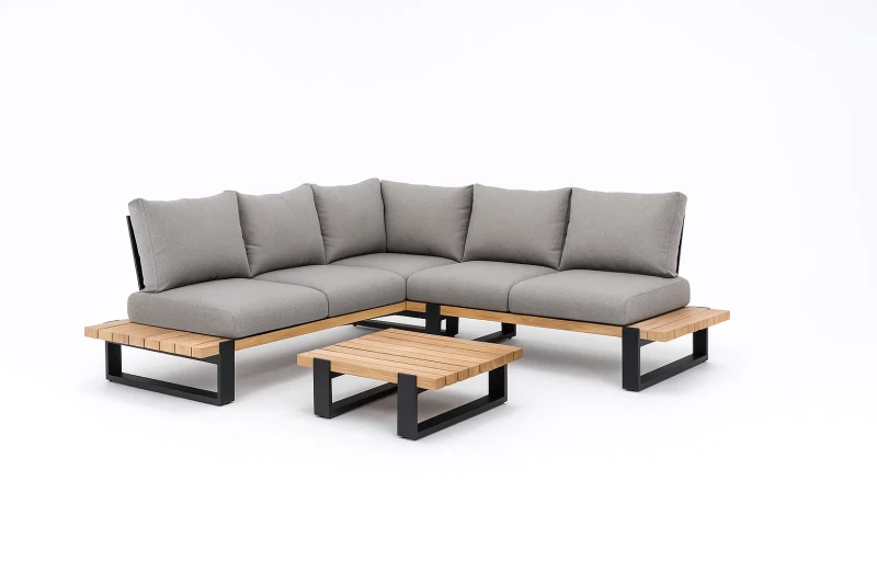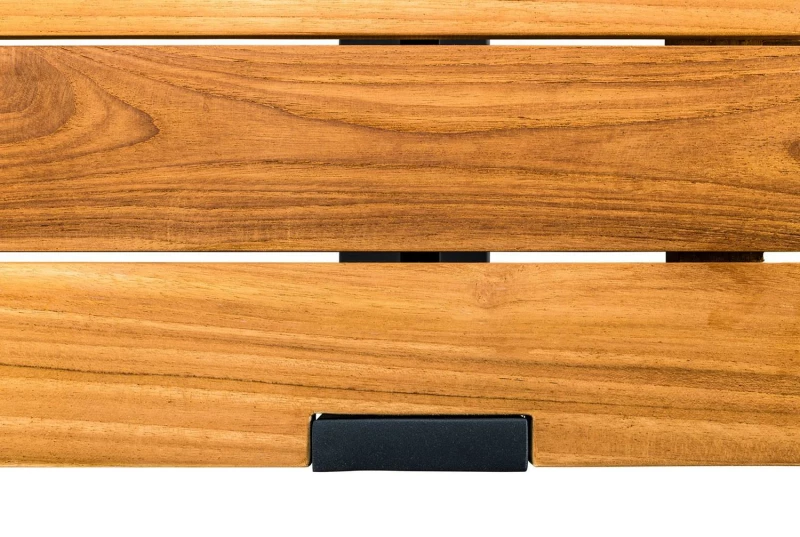 Hliníkový rám v matném antracitovém provedení je vysoce kvalitní materiál s dlouhou životností. Hliníkové nohy zajišťují robustní vzhled a pevnou konstrukci. Deska stolku a boční stolky jsou vyrobeny z certifikovaného teaku – pevného typu dřeva, které přirozeným způsobem přechází do teplé šedé, což mu dodává charisma a přirozený charakter.
