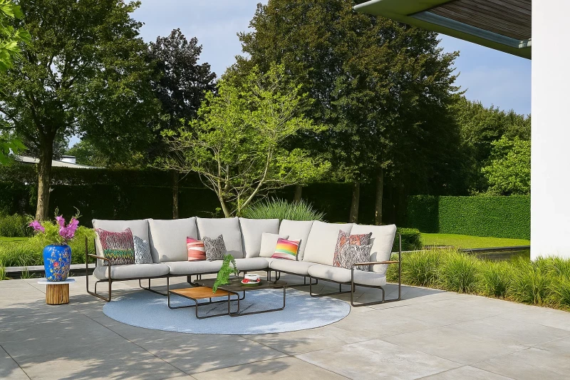 Zahradní rohový set SUNS Merano je ideální volbou pro velké terasy, kde hledáte luxusní a odolný venkovní nábytek s nadčasovým minimalistickým designem.