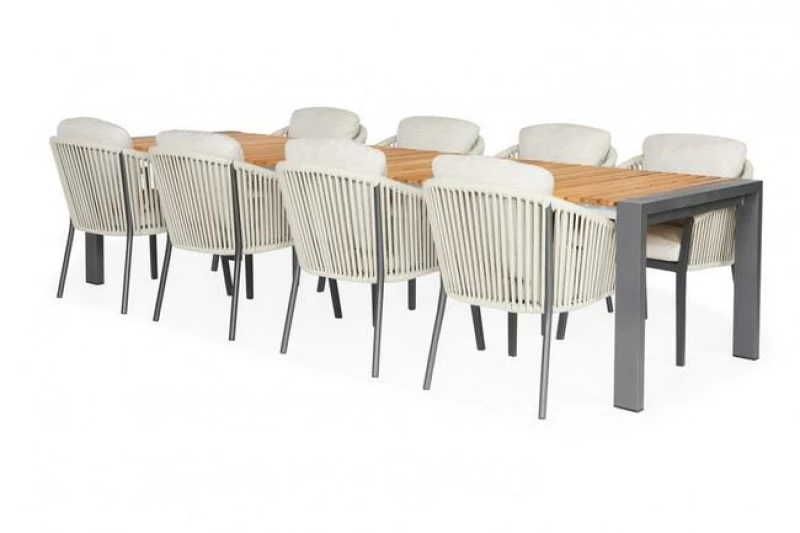 Díky jedinečnému posuvnému systému, který funguje podobně jako harmonika, můžete stůl během okamžiku rozšířit a vytvořit tak prostor pro další hosty. Tento sofistikovaný design kombinuje prémiové materiály – teakové dřevo a hliník– a představuje dokonalé spojení stylu a funkčnosti pro váš venkovní prostor.