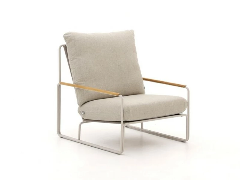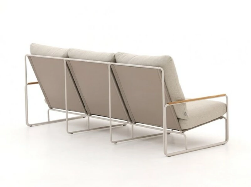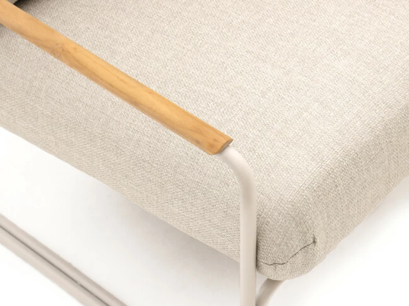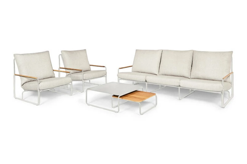Rám soupravy je vyroben z nerezavějící oceli s výjimečnou odolností vůči povětrnostním vlivům. Područky jsou potaženy certifikovaným přírodním teakem – velmi pevným dřevem s dlouhou životností. Teak časem získává teplou šedou patinu, která je součástí jeho přirozeného charakteru a dodává nábytku šarm.