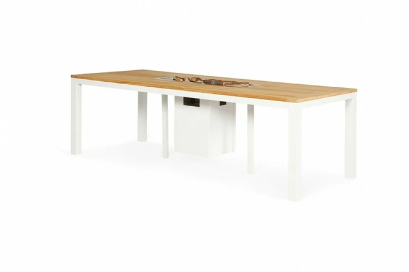 Střed stolu je otevřený pro integrované plynové ohniště, které lze dokoupit samostatně. Kombinace skutečného teakového dřeva a živého plamene vytváří neopakovatelnou atmosféru tepla, světla a pohody.