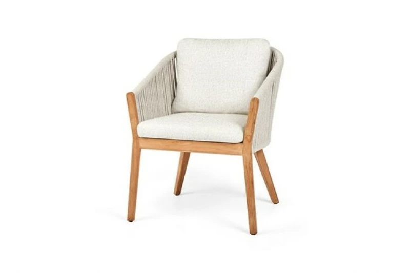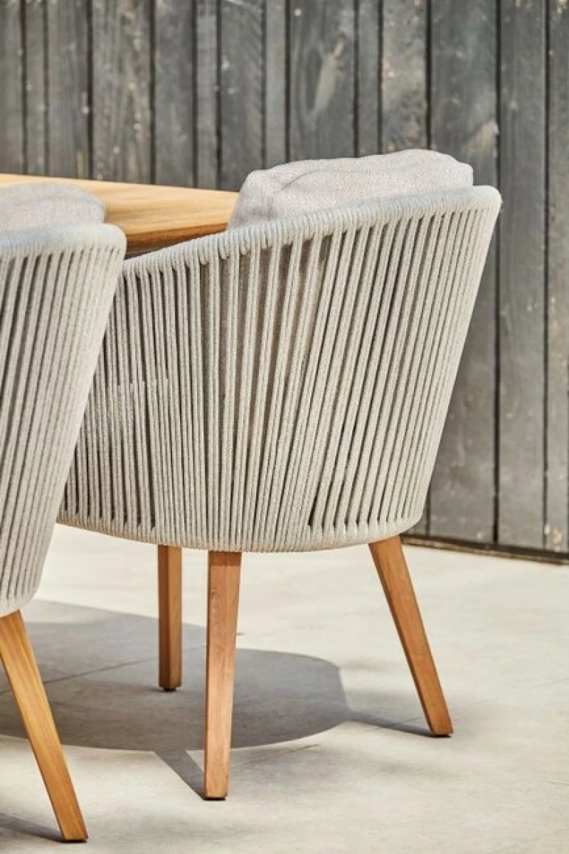 Stylová zahradní židle SUNS Senese s teakovým rámem a lanem v designu „rybí kosti“. Komfortní, odolná a elegantní židle s látkou Sunproof® a pěnou Quick Dry Foam® pro celoroční venkovní použití.