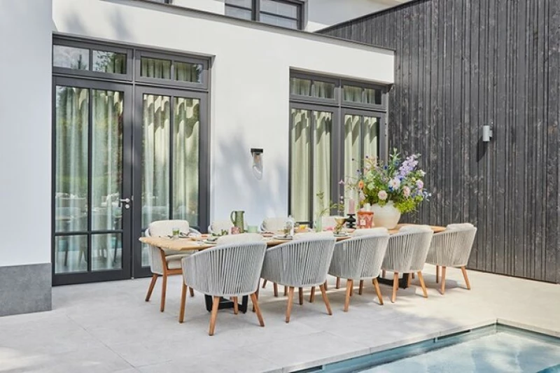 Rám židle je vyroben z certifikovaného teakového dřeva. Teak vyniká výjimečnou pevností, dlouhou životností a odolností vůči vlhkosti i teplotním změnám. Postupem času přirozeně přechází do teplého šedého odstínu, který podtrhuje jeho autentický a nadčasový vzhled.